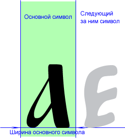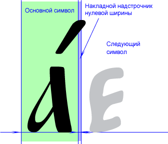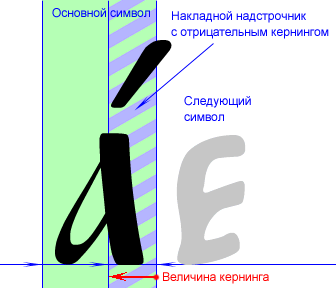 Способ реализации составного надстрочника, при котором под надстрочник выделяется отдельное знакоместо, его ширина устанавливается нормальной, а рисунок надстрочника не смещается влево за границы символа, оставаясь в пределах логических границ; вместе с этим, все кернинг-пары "буква+надстрочник" устанавливаются равными минус ширине надстрочника. Будучи вставлен в текст сразу за акцентируемой буквой, он, тем не менее, появляется над ней и не раздвигает текст вокруг себя -- все за счет заданного кернинга. Подробнее...